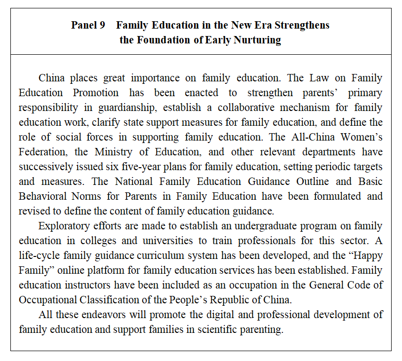 China places emphasis on fostering family culture, values, and traditions, recognizing the unique role of women in both social and family life. Efforts continue to be made to leverage women's distinctive contributions in promoting traditional Chinese family virtues and establishing positive family traditions. Policies supporting family development are continuously improved, enhancing families' capacity for development and creating favorable conditions for women to enjoy better family lives.