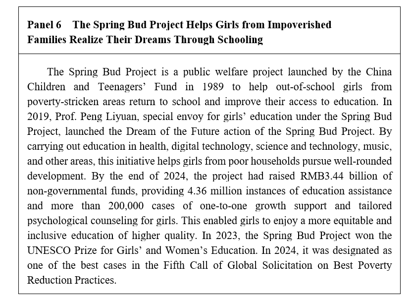 Through education initiatives for poverty alleviation, compulsory education in impoverished areas has been steadily improved, ensuring that no school-age girls from poor families drop out of school due to poverty.