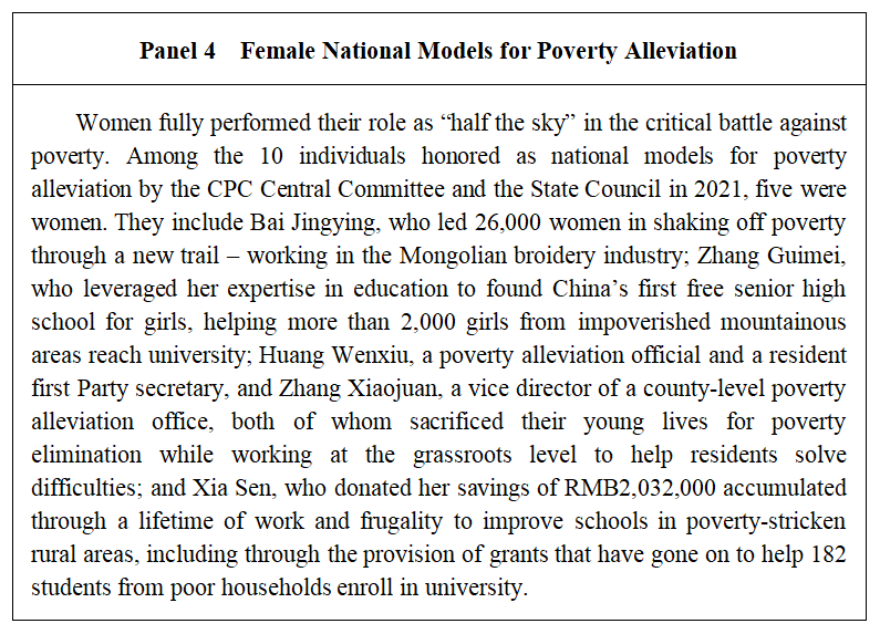 China has organized the largest and most intensive poverty alleviation campaign in human history, benefiting the greatest number of people. By the end of 2020, it had successfully eliminated absolute poverty throughout the country, meeting the poverty reduction target of the UN 2030 Agenda for Sustainable Development 10 years ahead of schedule. On this epic journey of poverty reduction, China has honored its solemn commitment that no one should be left behind, specifically targeting women as a key group to widen their path towards prosperity.