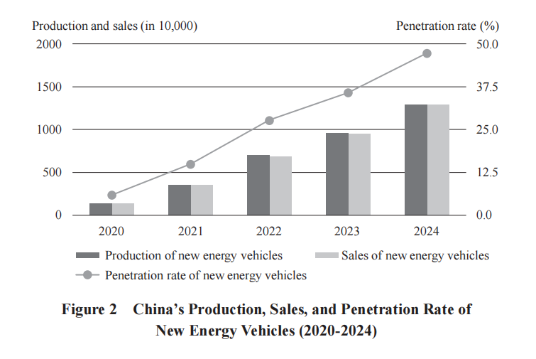 Promoting low-carbon transport. China leads the world in the scale and speed of development of new energy vehicles. During the period from January to September 2025, the penetration rate of new energy passenger vehicles in the domestic market reached 52.2 percent, ranking top among major economies. China leads the world in the electrification of railways, with the electrification rate reaching 76.2 percent in 2024. China has promoted clean power in ships and aircraft. By 2024, fuel consumption per tonne/km of the civil aviation transport fleet had dropped by 20.5 percent compared to the 2005 baseline. China has moved further in the use of shore power for key anchored ships in key areas and on key routes. Over 90 percent of specialized berths in China's major ports have access to shore power. China's civil aviation airports lead the world in electrification. By the end of July 2025, electric vehicles accounted for 32 percent of all vehicles in China's civil aviation airports.